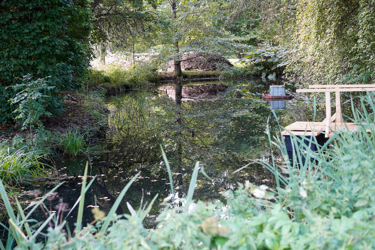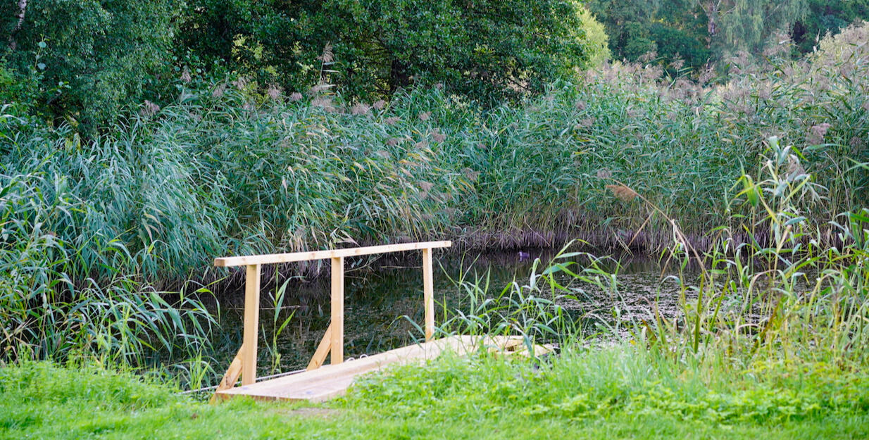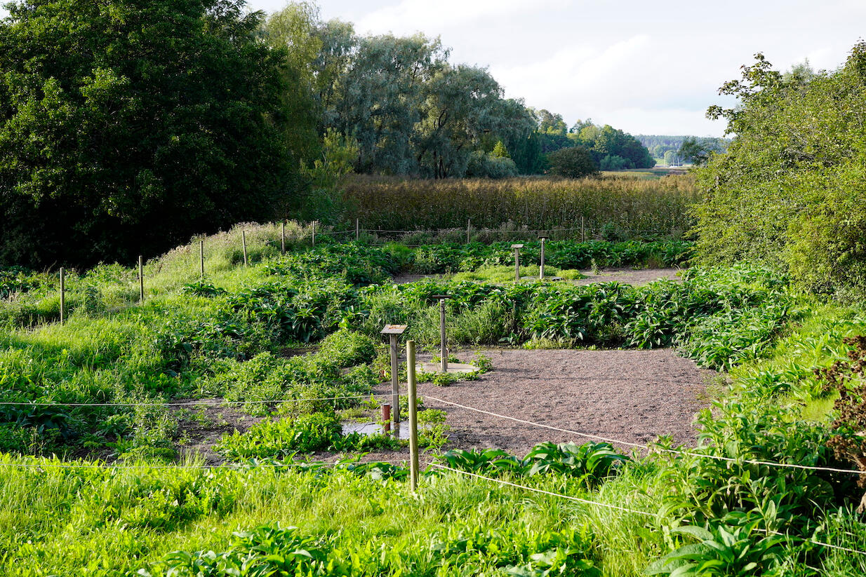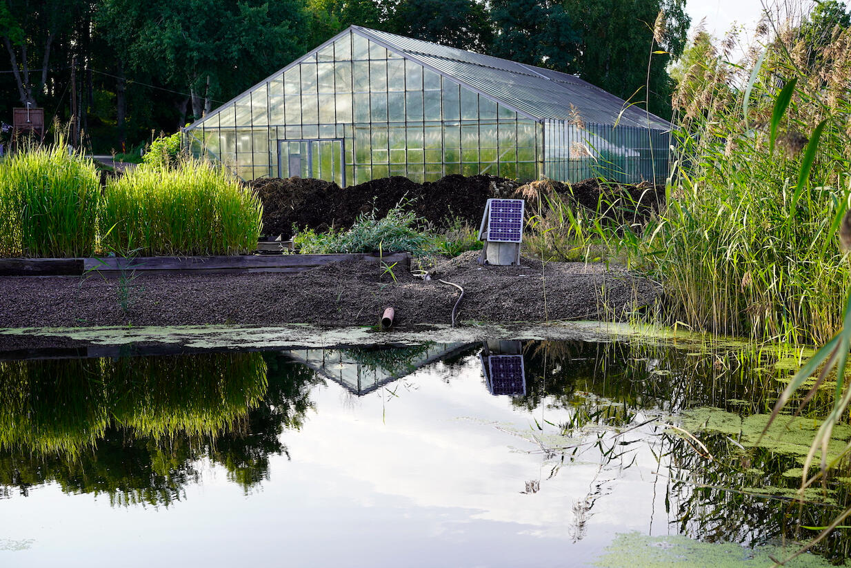 Runt Nibble Trädgård finns ett par dammar där regnvatten samlas upp från taken för bevattning av grönsaksodlingarna. Här utvecklar Virbela Ateljé olika lösningar för hantering av dagvatten ska bli en värdefull resurs i en kretsloppsgård.